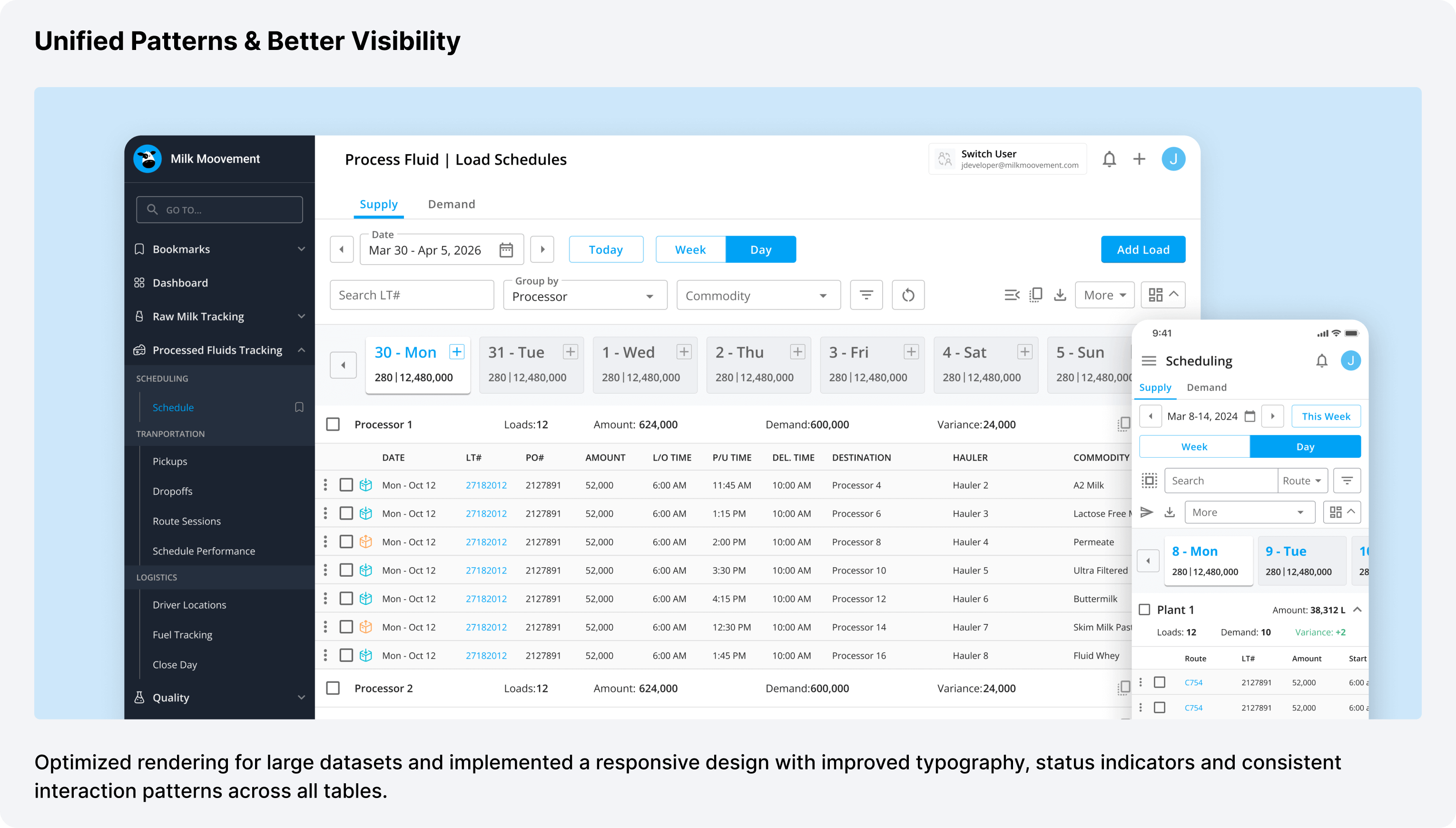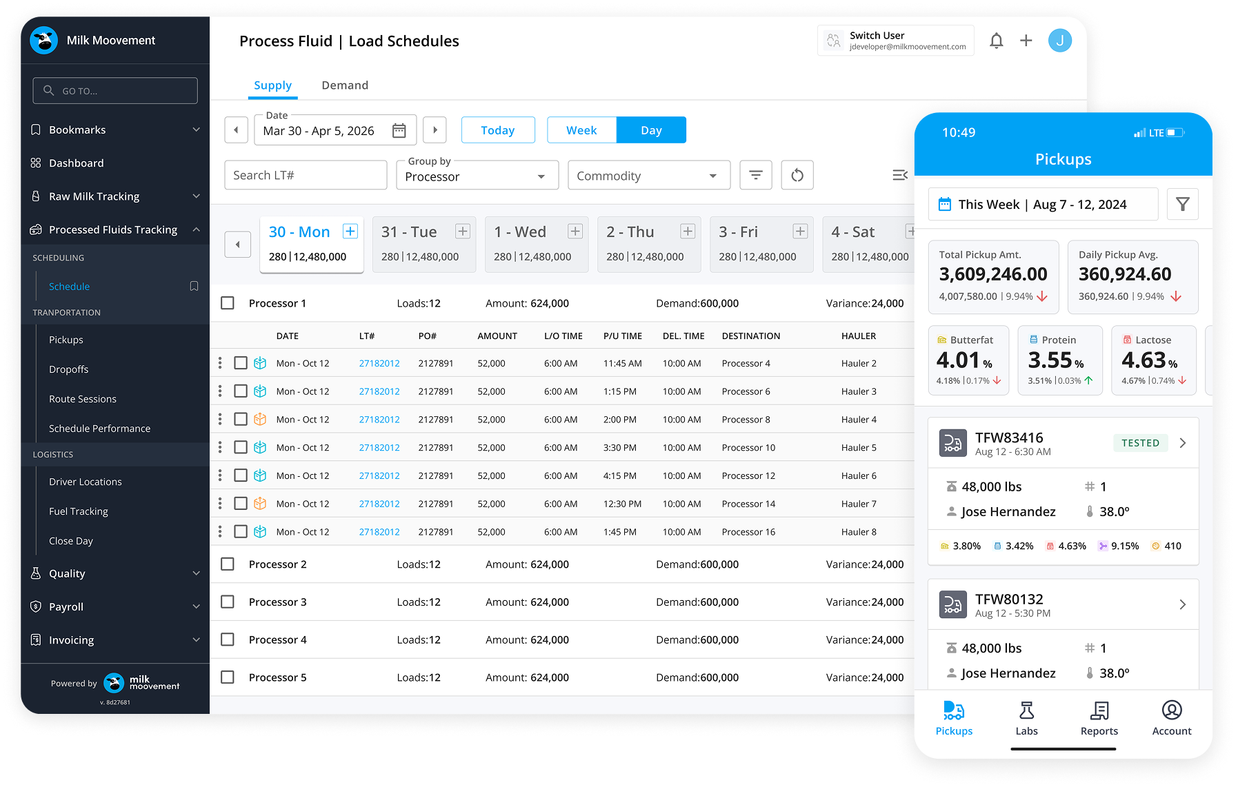 Dairy operations happen in the field—drivers picking up milk from farms, plant receivers managing incoming loads, and producers tracking their operations. These users needed mobile-first experiences designed for their specific workflows and environments.