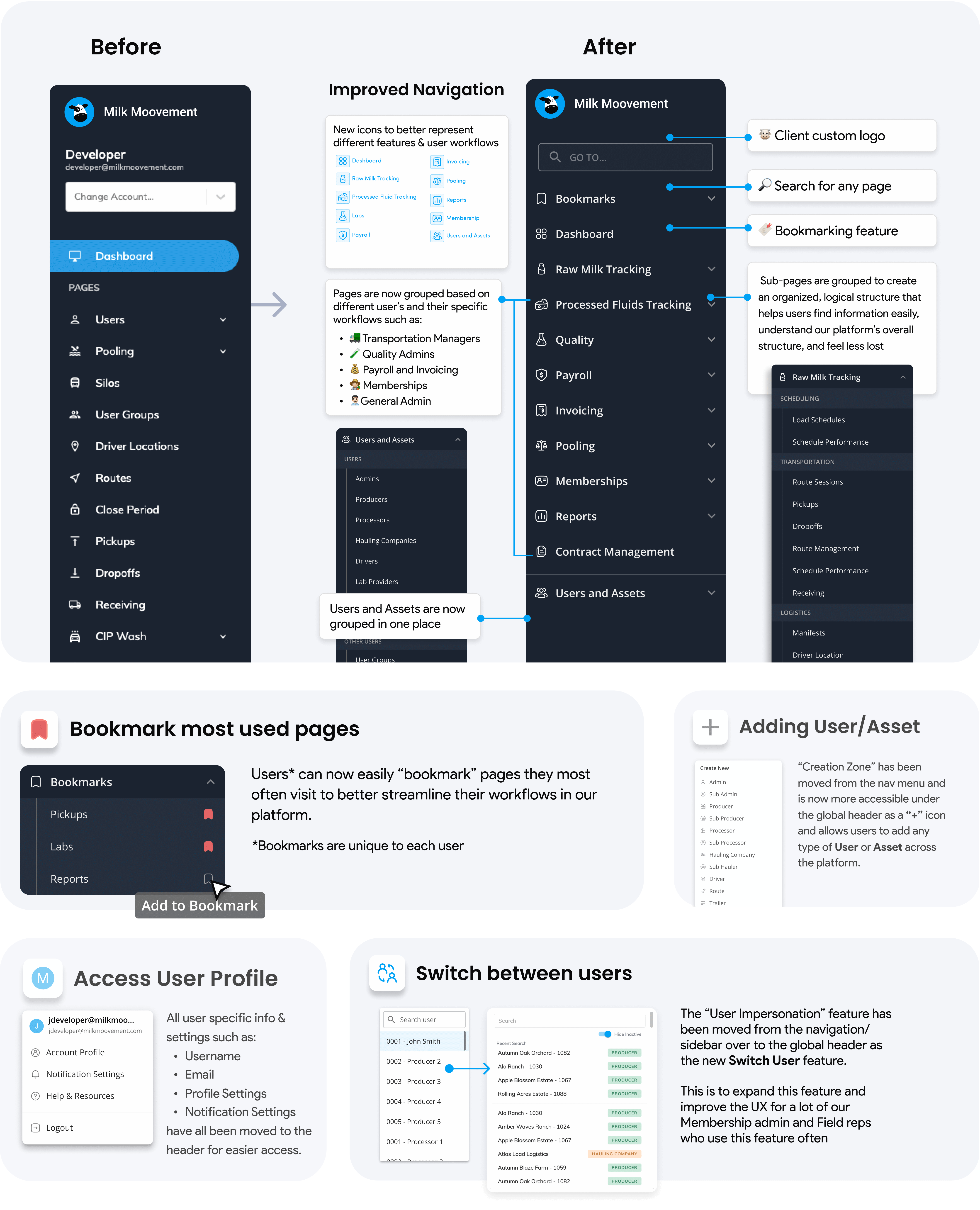 I redesigned the navigation to improve usability, clarity, and scalability while maintaining all user permissions. The new structure surfaces essential features immediately and reduces clutter through a clear hierarchy that balances simplicity with flexibility. Frequently used features appear at the top level, while secondary options are revealed contextually to minimize cognitive load.