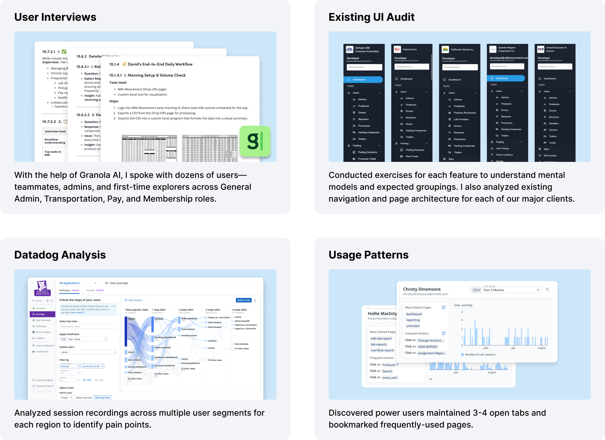 The navigation research revealed who our users were. The table work gave me the patterns. Now it was time to meet them where they actually work—in trucks, on loading docks, and in the farms.